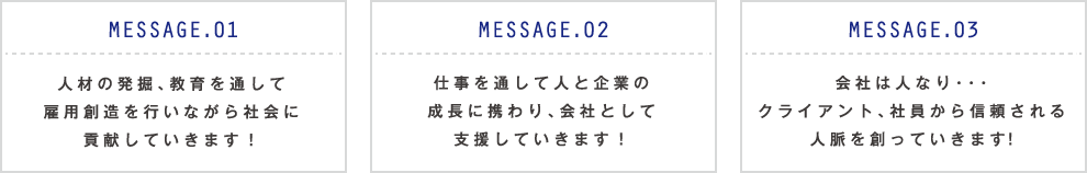 | 業務内容 | 各種人材派遣サービス 厚生労働省大臣 許可番号 派23-020353 |